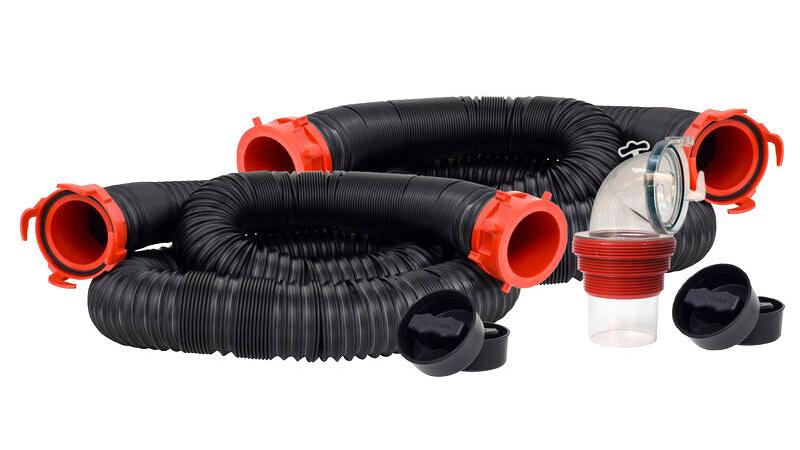 The Valterra Dominator RV Sewer Hose Kit includes 2 functional 10-foot sewer hoses, a clear 90-degree adapter, and 4 drip caps.