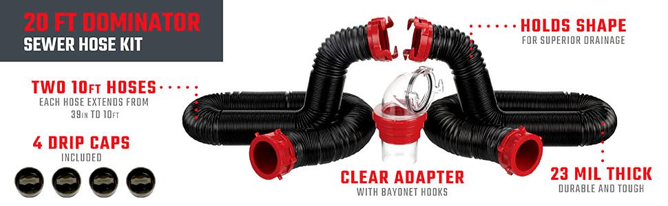- CAMPER SEWER HOSE KIT: The Dominator hose kit includes 2 collapsible 10-foot hoses with rotating fittings plus a 90 degree universal sewer adapter and 4 drip caps